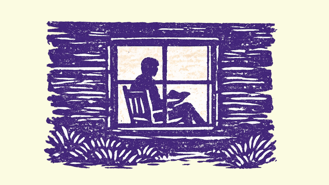 Looking across the field at this lone cabin, with its lit window, one would see little action. There would be a figure sitting in the corner, a reading silhouette. A broom leaned on the porch. Smoke rising from the fire.